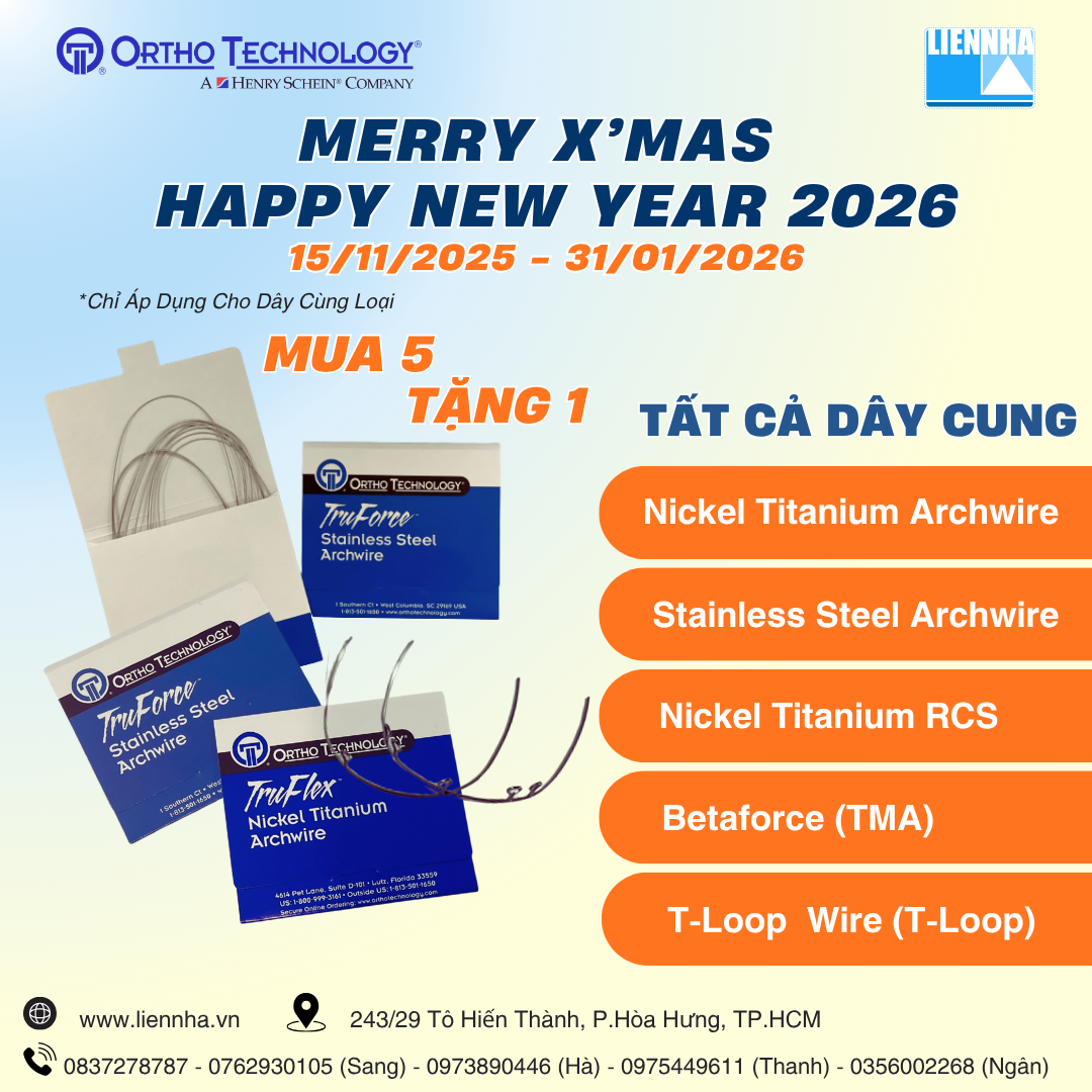 🎅 Mua 5 – Tặng 1 cho mọi loại dây cung hoặc hóa đơn từ 2.500.000 VNĐ: tặng 1 NiTi archwire hoặc 2 dây Stainless Steel