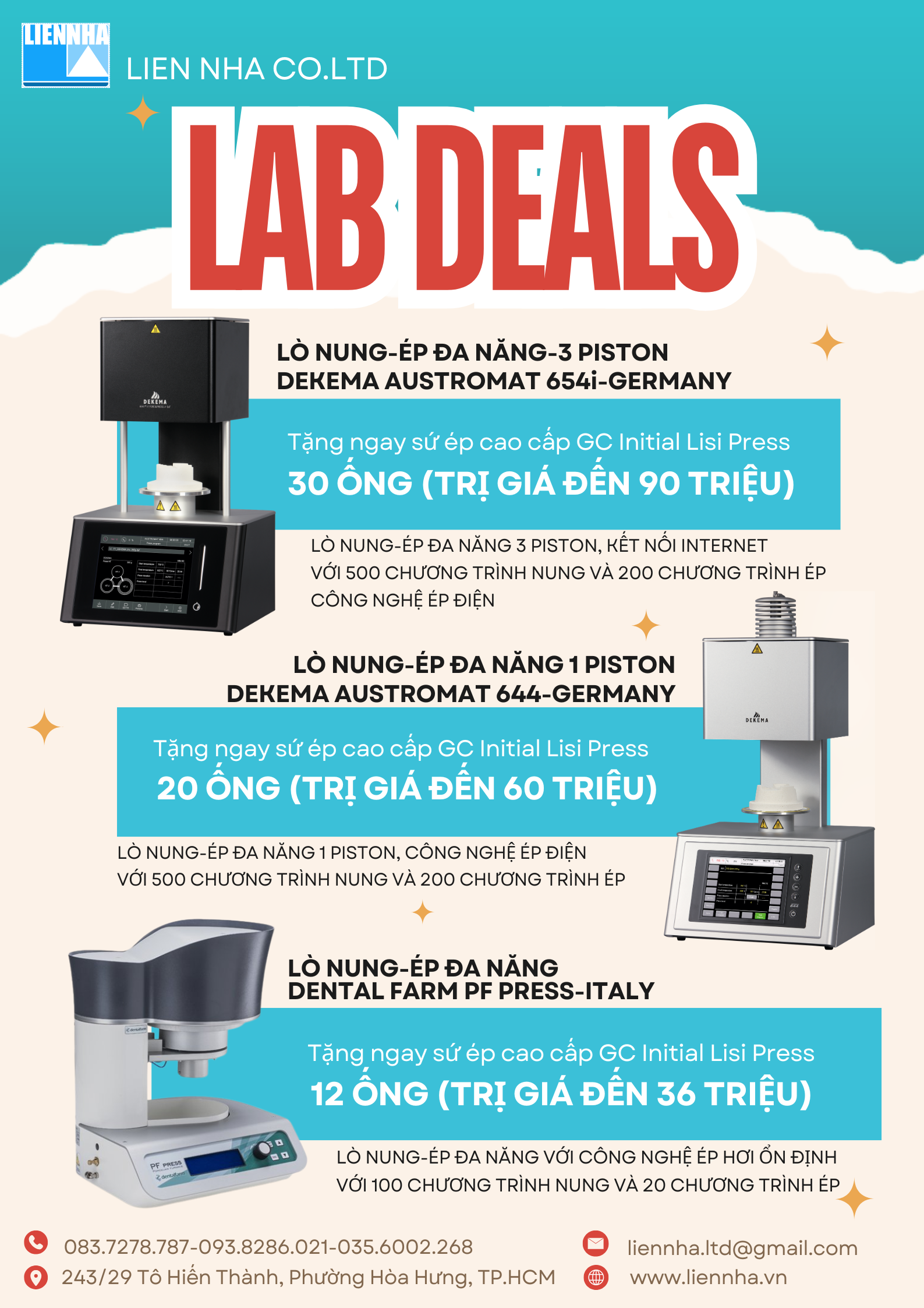 Nhằm hỗ trợ các Labo phục hình răng sứ nâng cấp hệ thống sản xuất, Lien Nha Co., Ltd triển khai chương trình khuyến mãi đặc biệt dành cho các dòng lò nung-ép nha khoa cao cấp từ Đức và Italy.